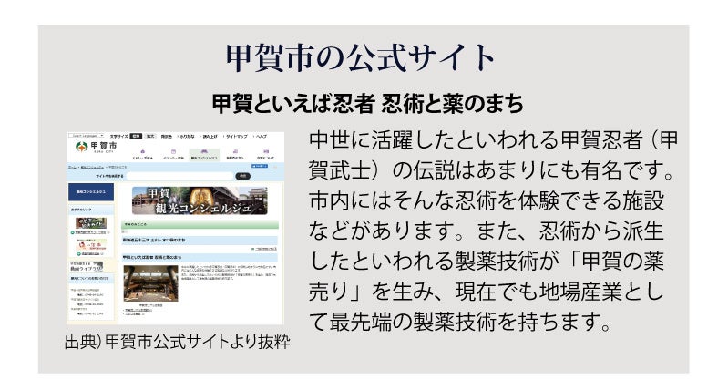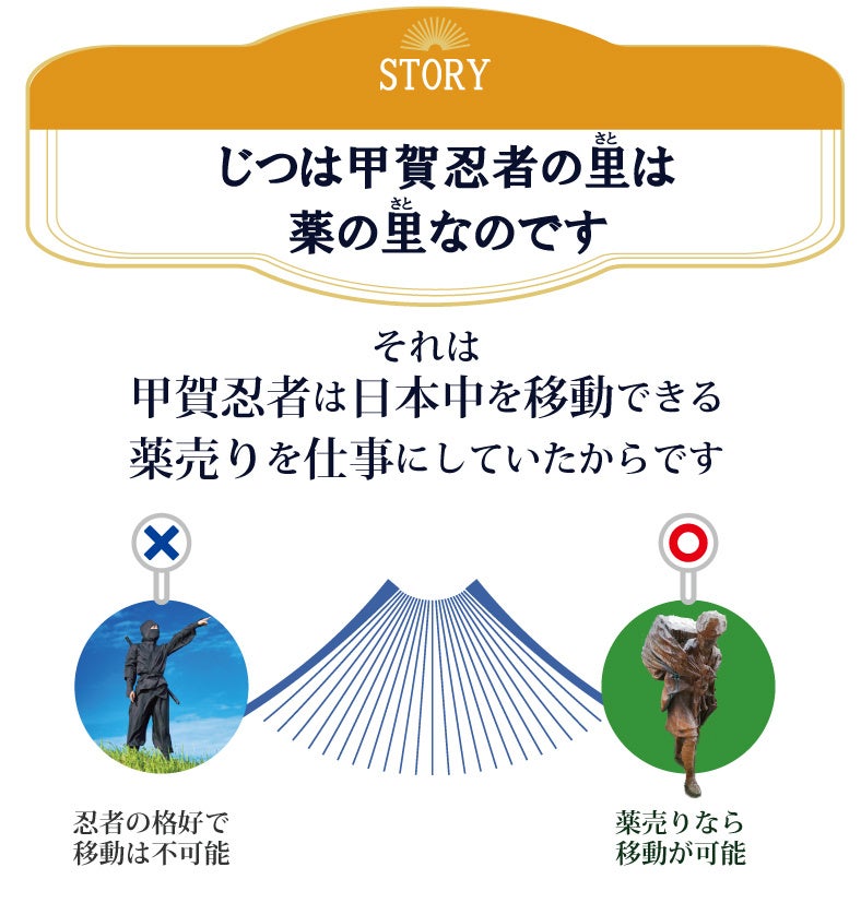 甲賀忍者の里(甲賀市)には、実は製薬会社が多く存在します。昔の日本では移動が制限されていましたが、薬売りは全国を移動することが許されていました。そのため、甲賀忍者は、薬売りとして全国を巡っており、その流れで、今でも甲賀市には製薬会社が多いのです。