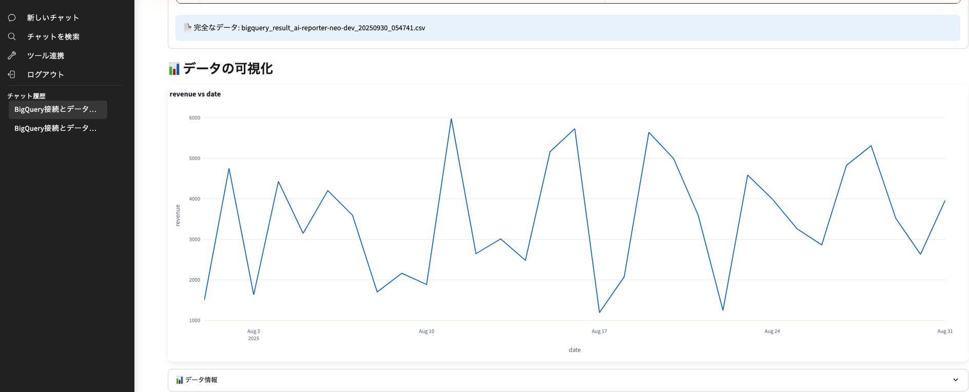 単なるデータ抽出や可視化にとどまらず、AIが結果を解釈し、ビジネス上のインサイトや次のアクションを提示します。これにより、従来の「データを確認する」から「データを活用して意思決定を下す」までをワンストップで実現します。 -