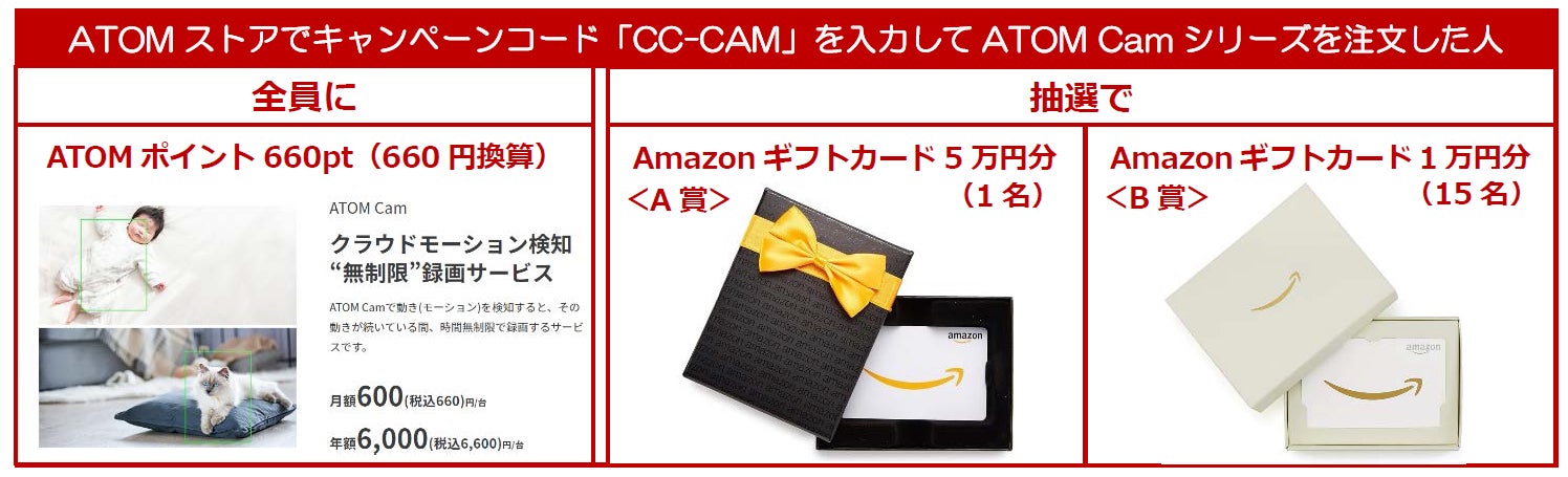 キャンペーンコード「CC-ACS」を入力してATOM Camシリーズ(ATOM Cam 2またはATOM Cam Swing)を購入したユーザー全員に、クラウドモーション検知“無制限”録画サービスの利用料1ヵ月分に充当できるATOMポイント660ptをプレゼントするとともに、抽選で1名様にAmazonギフトカード5万円分を、15名様に同1万円分をプレゼントします。