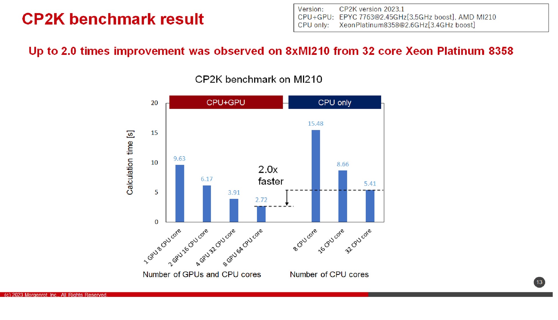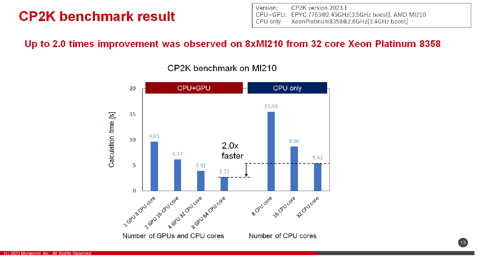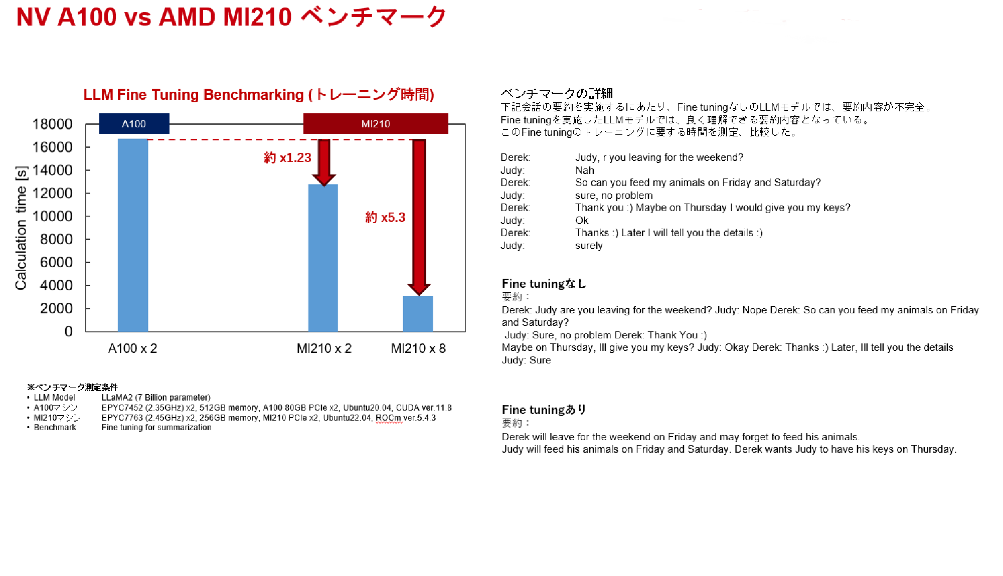 AMD Instinct™ MI シリーズ・アクセラレーターはNVIDIAの同等製品と比較してコストパフォーマンスに優れた製品です。モルゲンロットではお客様にご安心して導入いただく為に、米AMD社と共同でソフトウエアの動作確認及び動作手順書の作成を進めております。同時に性能比較検証も実施しておりますのでご参考にしていただけます。