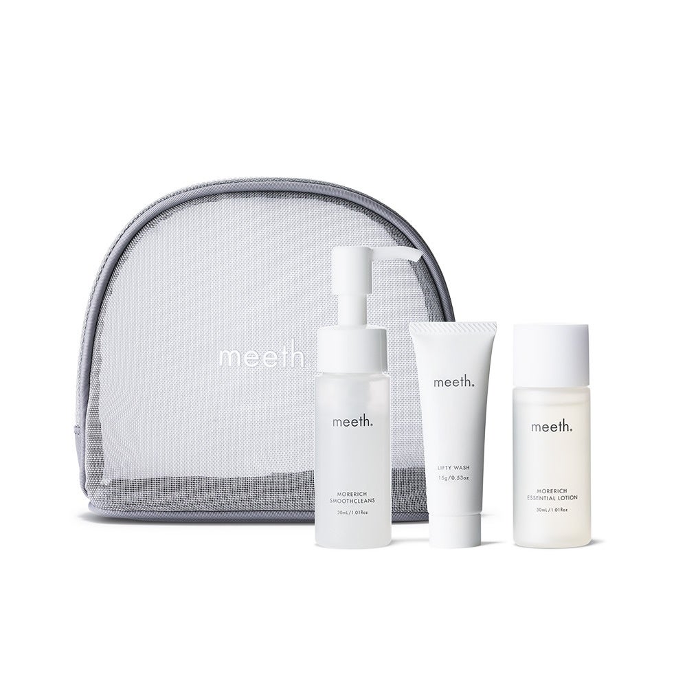 meethのベーシックスキンケア3アイテムが入った、初めての方にぜひ使っていただきたい1週間分のセットに、スキンケアの最後にご使用いただける朝用クリームをプレゼント。