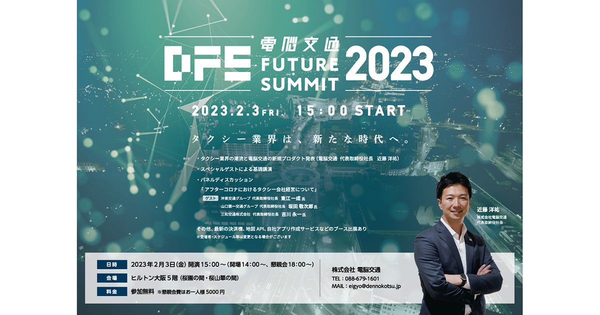 株式会社電脳交通(本社:徳島県徳島市、代表取締役社長:近藤 洋祐、以下「電脳交通」)は、2023年2月3日(金) ヒルトン大阪にて、電脳交通の新規プロダクト発表ならびに、豪華ゲストを招いてアフターコロナのタクシー経営について考えるイベント「電脳交通 FUTURE SUMMIT 2023」を開催いたします。