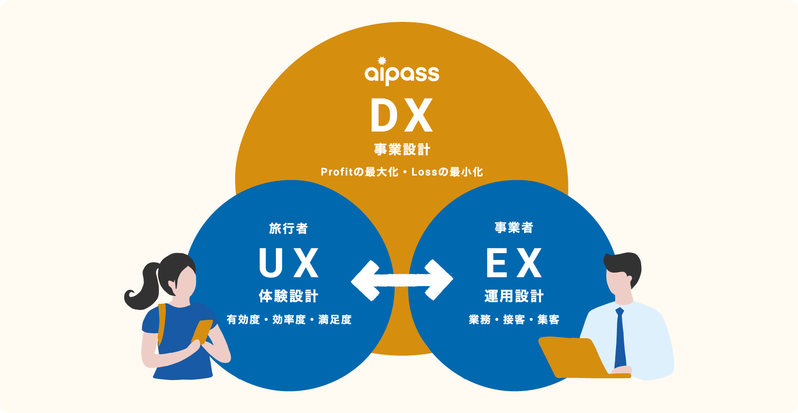 「UX(旅行者)とEX(従業員)」それぞれの体験を設計し、最適な機能を提供することで、経営課題を解決しDXを実現するシステムです。