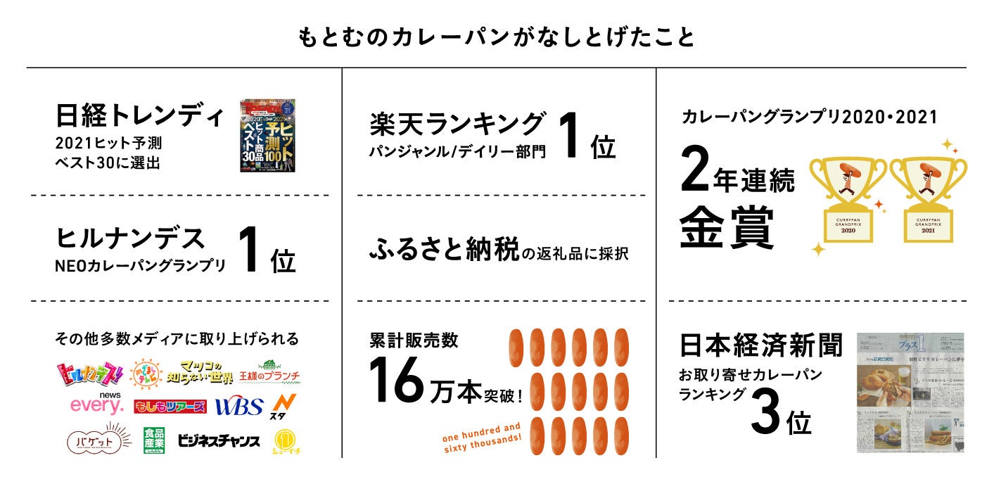 2020年に公式オンラインショップを開設し、多い日には1日に約6,000本を販売。各メディアにて入手が難しい「幻のカレーパン」としてご掲載をいただき、日本一のカレーパンを決める「カレーパングランプリ2021」では沖縄県勢初となる、2年連続金賞を獲得。さらに2021年12月に「日本経済新聞」の土曜版「NIKKEIプラス 1」のお取り寄せカレーパンランキングで「もとむのカレーパン」が3位を獲得しました。2022年4月から沖縄県内でラジオCM放送中!