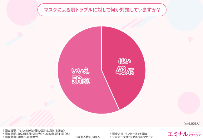 そこで、「マスクによる肌トラブルに対して何か対策していますか?」と質問したところ、4割以上が『はい(43.4%)』、5割強が『いいえ(56.6%)』と回答しました。