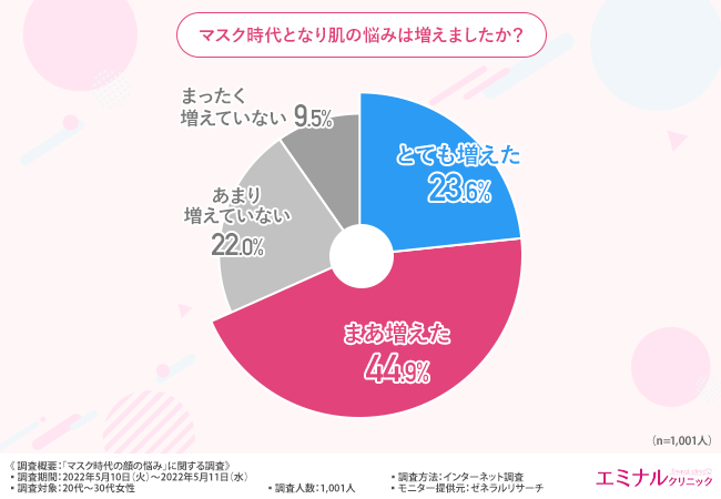 「マスク時代となり肌の悩みは増えましたか?」と質問したところ、『とても増えた(23.6%)』『まあ増えた(44.9%)』『あまり増えていない(22.0%)』『まったく増えていない(9.5%)』という結果となりました。