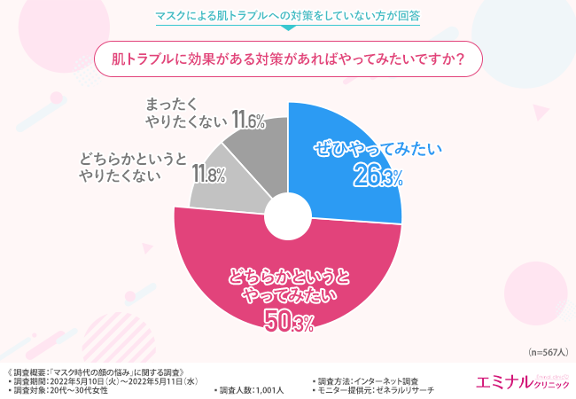 先程の質問で『いいえ』と回答した方に、「肌トラブルに効果がある対策があればやってみたいですか?」と質問したところ、『ぜひやってみたい(26.3%)』『どちらかというとやってみたい(50.3%)』『どちらかというとやりたくない(11.8%)』『まったくやりたくない(11.6%)』という結果となりました。