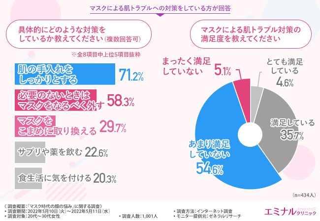 お手入れをしっかりする・マスクを外すといった肌トラブルの対策を行っても、約6割の女性が満足していないことが分かり、また対策していない方の理由として「どうしたら良いのか分からない」といった理由があるようです。