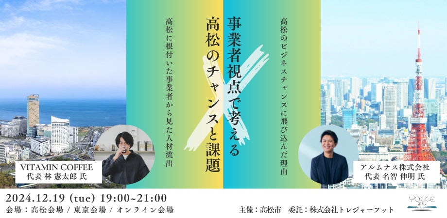 2人の事業者から見た、ビジネス視点での高松を語るゲストトークほか、高松でのビジネスチャンスを考えるワークショップを開催。(東京会場・高松会場・オンライン会場の3拠点同時開催)