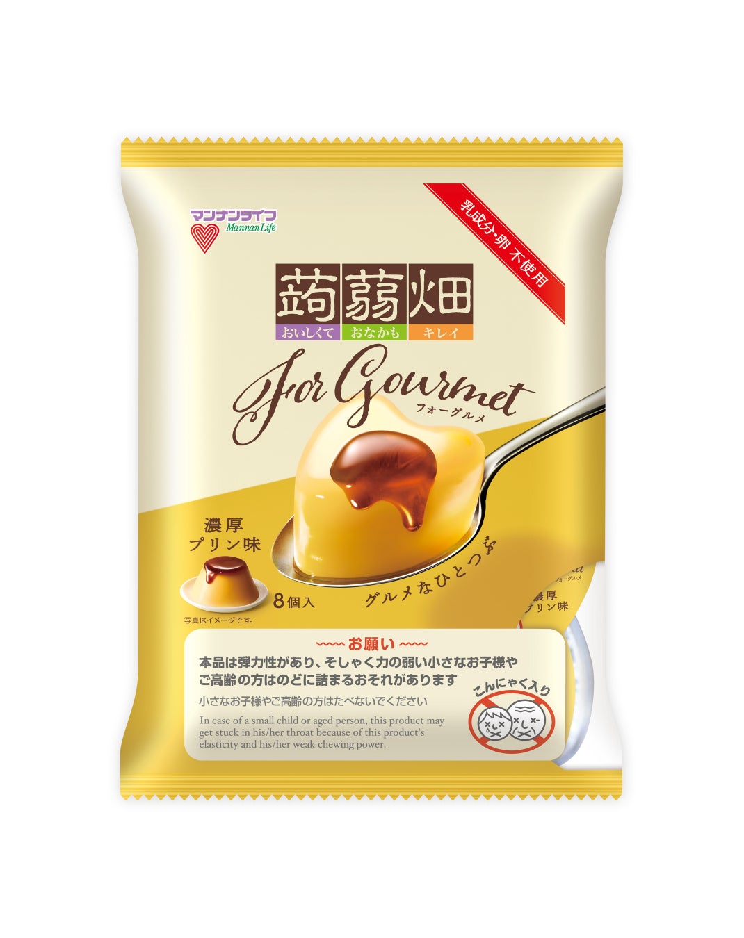 蒟蒻畑の特性から生まれる独特の食感は、プリン風味と相性抜群です。カスタードとカラメルの絶妙なバランスにこだわり、弾力のある蒟蒻畑にピッタリなコクのあるクリーミーな味わいのプリン味に仕上げました。乳成分・卵不使用で、アレルギーのある方でも安心してお召しあがりいただけます。