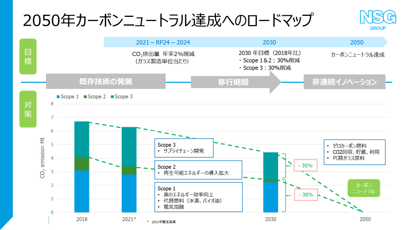 当社グループでの最近の取り組みとしては、英国において板ガラス製造業として世界で初めて水素、バイオ燃料による製造実証実験にそれぞれ成功したほか、世界各地の事業所敷地内への太陽光発電設備やカナダでの蓄電設備の設置、ポーランドでの風力発電会社とのVPPA(Virtual Power Purchase Agreement:仮想電力購入契約)などの再生可能エネルギーの導入拡大をはじめ、さまざまなCO2排出削減の施策を進めています。NSGグループは今後も2030年目標および2050年のカーボンニュートラル達成に向けた努力を続けてまいります。