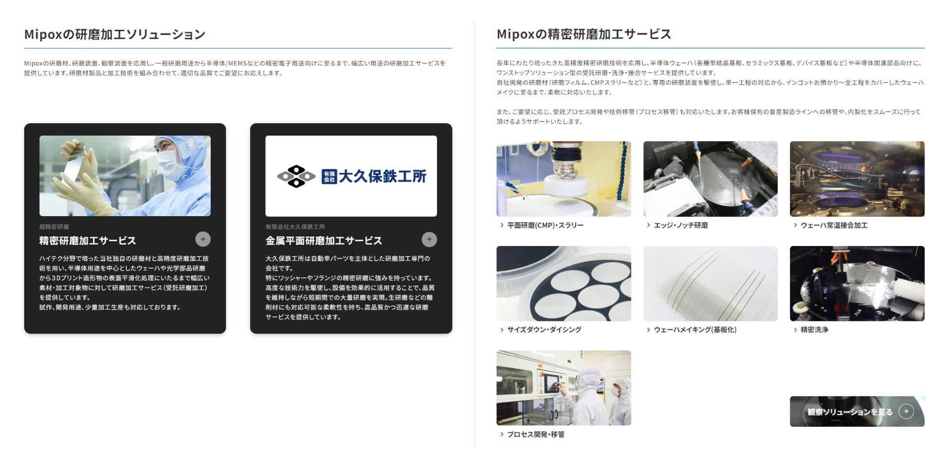 精密研磨加工サービスについては、ハイテク分野で培った当社独自の研磨材と高精度研磨加工技術を用いた研磨加工サービスから、近年の実績を踏まえた情報を大幅に拡充。以前の「ウェーハエッジ研磨」と「常温接合」の2カテゴリーから、「平面研磨(CMP)・スラリー」 「サイズダウン・ダイシング」「ウェーハメイキング(基板化)」「精密洗浄」「プロセス開発・移管」を加えた7つのサービスそれぞれに詳細ページを設けました。