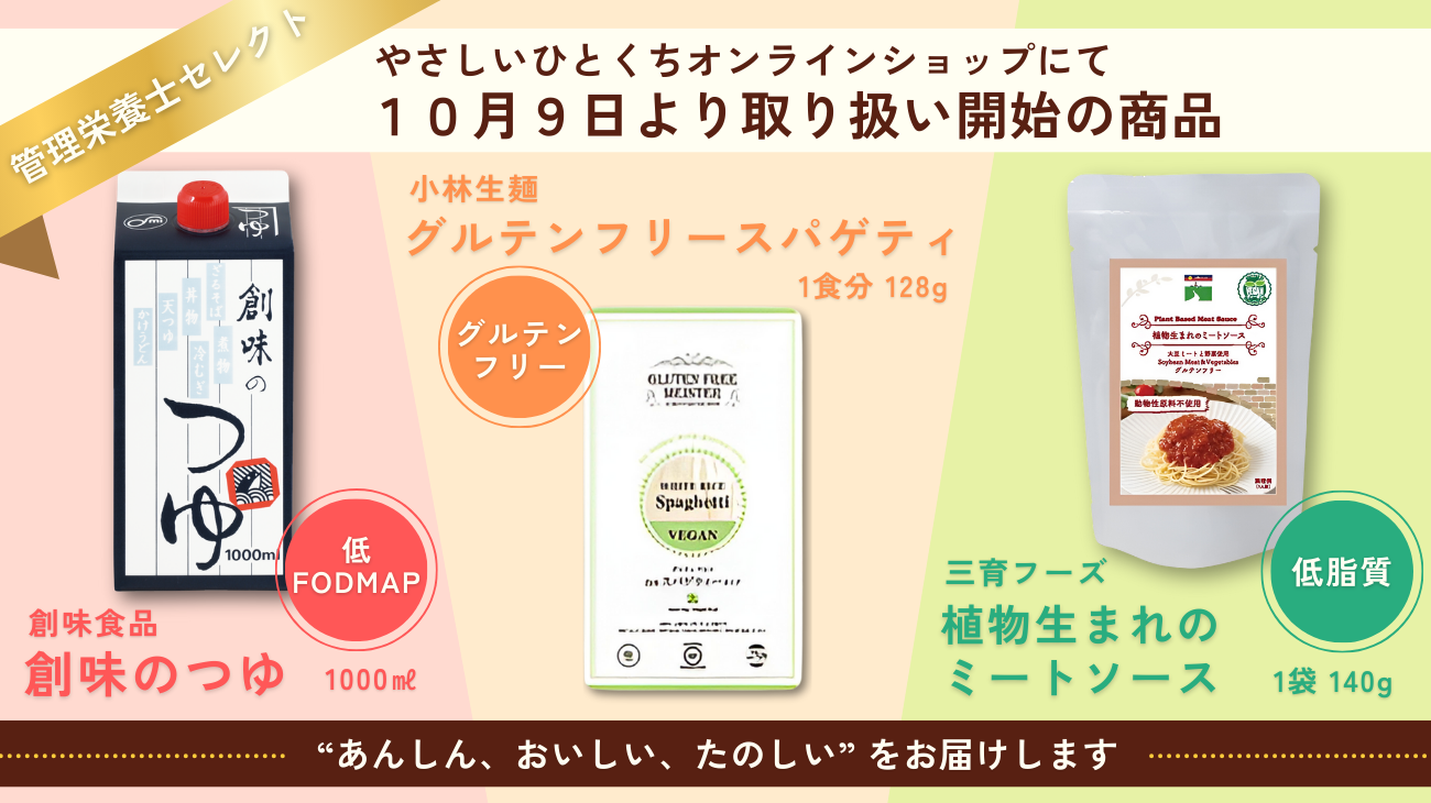 グッテ管理栄養士がお腹にやさしいをコンセプトに選定した「創味のつゆ」「グルテンフリー スパゲッティ」「植物生まれのミートソース」をやさしいひとくちオンラインショップにて10月9日より取り扱い開始