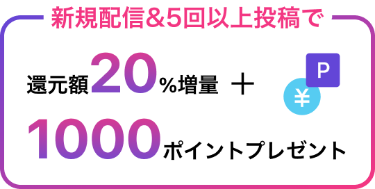 キャンペーン期間中の新規の配信開始で半年間の収益還元額が20%アップ!併せて、5回以上の放送を投稿すれば1,000ポイントプレゼント!