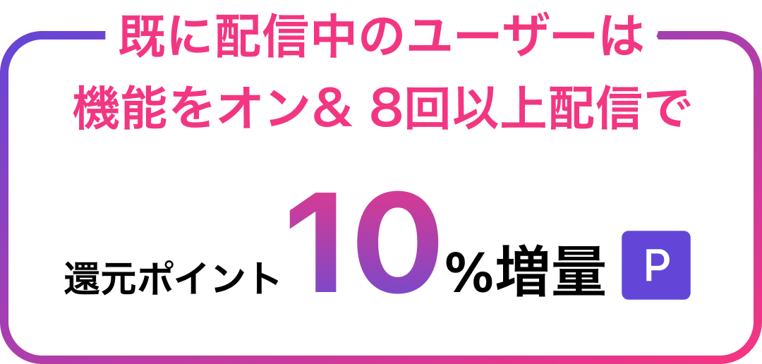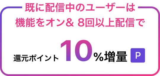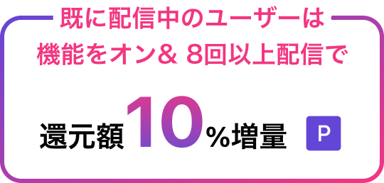キャンペーン期間中に「収益化プログラム機能」をオンして8回以上配信すれば、半年間の収益還元額が10%アップ!