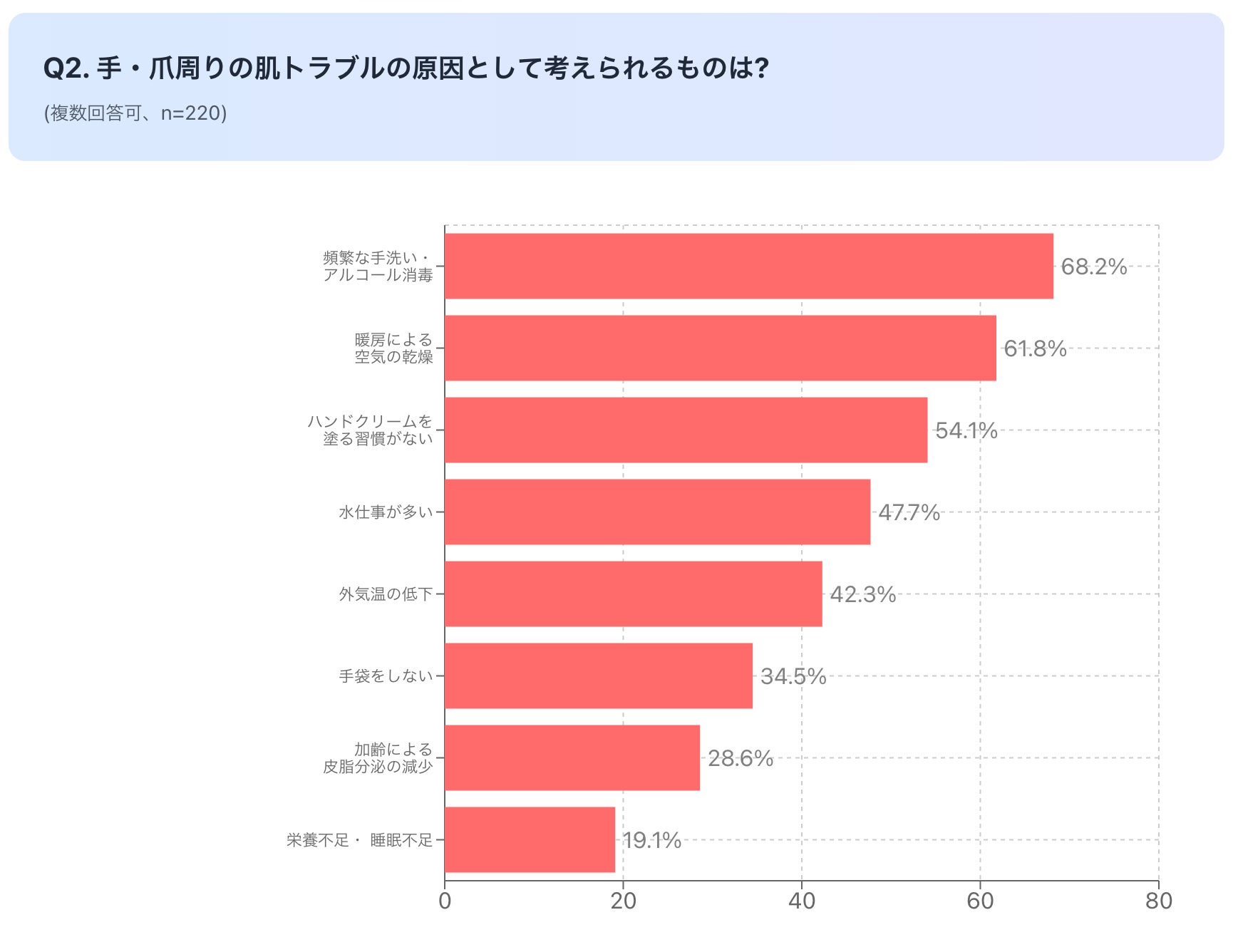 その結果、「頻繁な手洗い・アルコール消毒」が68.2%で最も多く、次いで「暖房による空気の乾燥」(61.8%)、「ハンドクリームを塗る習慣がない」(54.1%)という結果になりました。