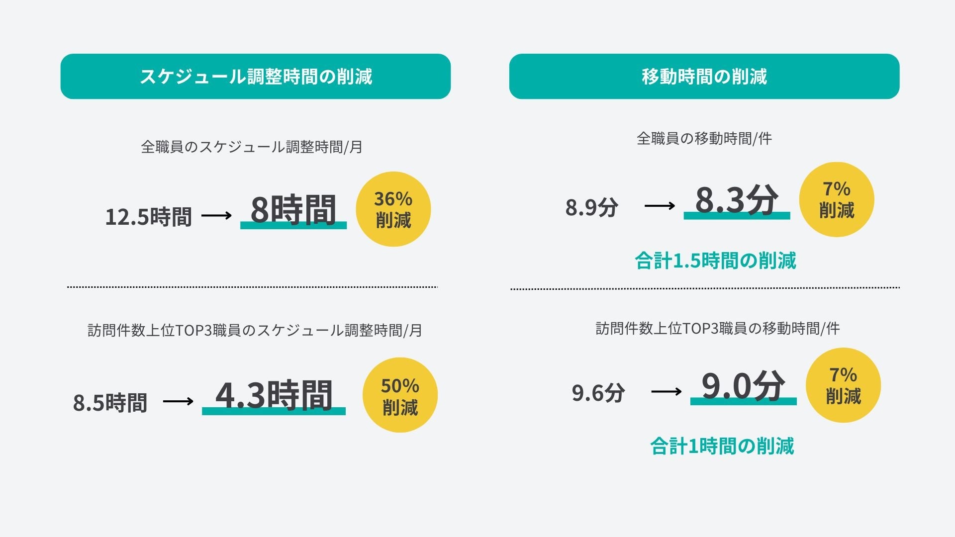 ケアマネジャーのスケジュール調整時間は、従来の手作業による調整と比較して約36%削減されました。特に、訪問件数の多いケアマネジャーに絞ると、約50%もの大幅な時間削減効果が得られました。