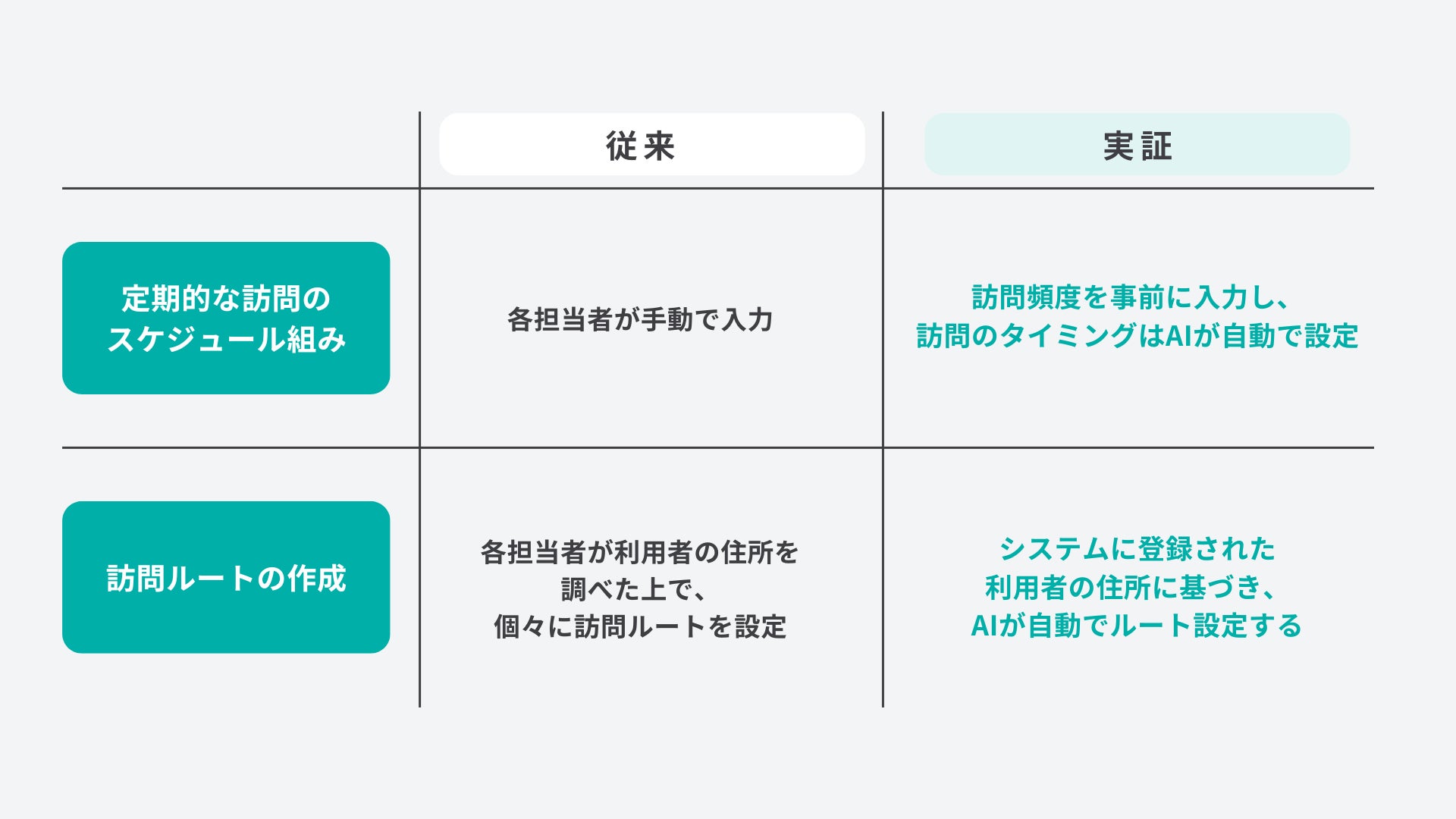 本実証実験では、従来手動で行っていた訪問スケジュールの作成、ルート調整、担当割り当てを、ZEST SCHEDULEを導入することで自動化し、業務効率の変化を検証しました。ZEST SCHEDULEは、AIがスケジュール作成者に代わり、利用者と職員のマッチング要素、移動時間、職員の勤務シフトなど、業界特有の条件を考慮した最適なスケジュールを提案するシステムです。