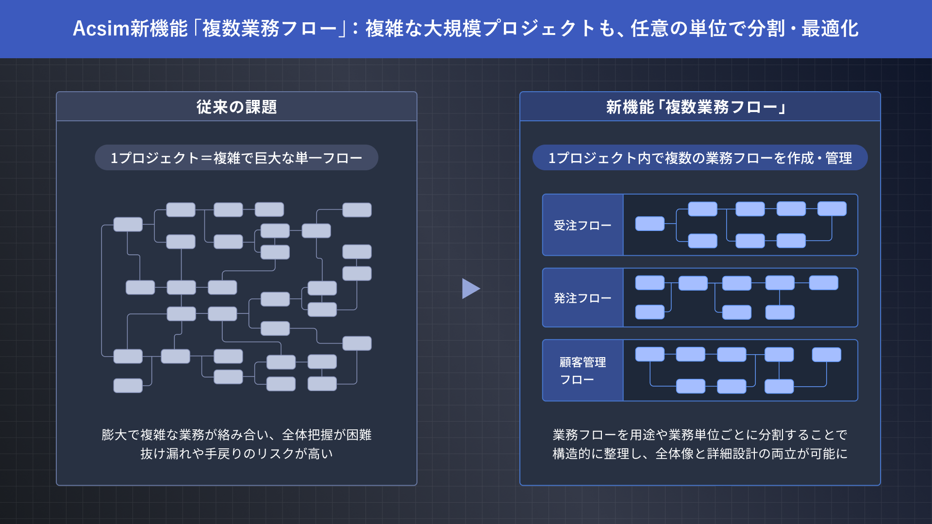 このような課題を解決するべく、複雑な業務を整理・構造化し、分割して設計・管理できる新機能「複数業務フロー」の開発に至りました。これにより、大規模開発に伴う複雑性を解消し、誰もが高度な要件定義を効率的に行える環境を提供することで、企業のDX推進を加速します。