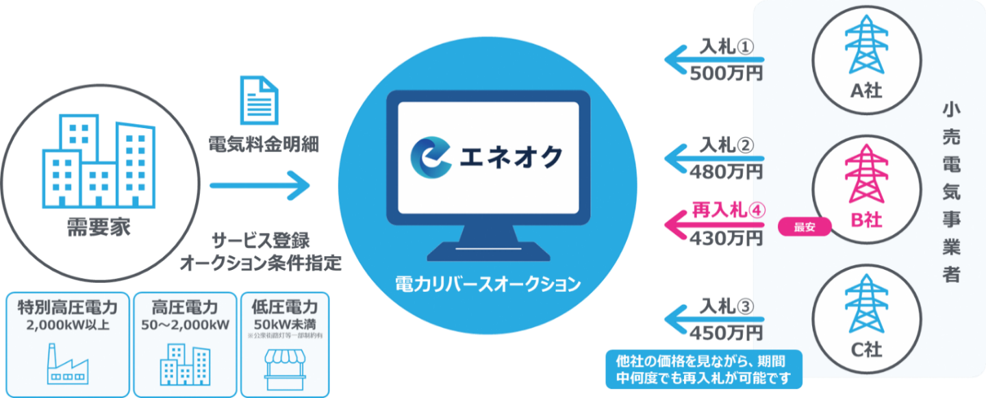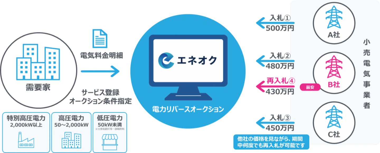 エナーバンクは、小売電気事業者が他社の入札価格が見える状態で、一定期間何度でも再入札が可能な競り下げ方式によるオークションを通じて需要家と小売電気事業者をマッチングするサービス「エネオク」を提供しています。
