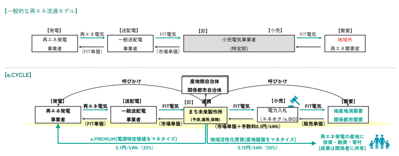 (*)「e.BID(いいビッド)」は、再生可能エネルギーを使いたい企業や団体が、「e.CYCLE(いいサイクル)」上で地域の再エネを指定して契約できる仕組みです。複数の会社の電気の応札結果を取りまとめてプランを比較することができるため、入札者は納得した価格で再エネを契約することができます。