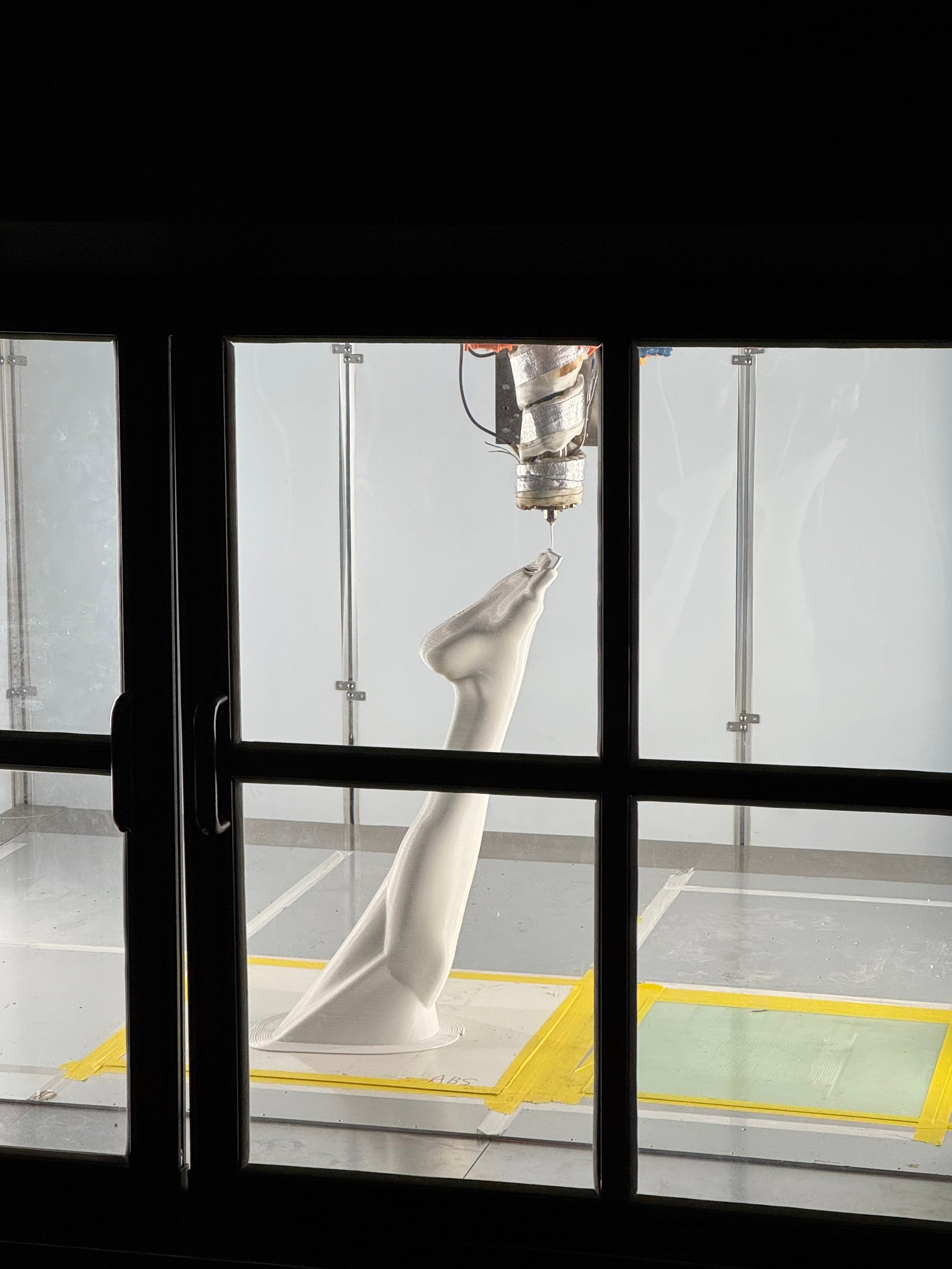 3Dプリントには、ExtraBoldが自社開発・製造販売するFGF方式の大型3Dプリンター「EXF-12」および協働ロボット型3Dプリンター「REX-BUTLER」を使用しました。本作品は、樹脂ペレットを直接溶融し積層するFGF(Fused Granular Fabrication)方式により3Dプリントされています。この方式は大型3Dプリントに適しており、材料選択の自由度が高いことが特長です。