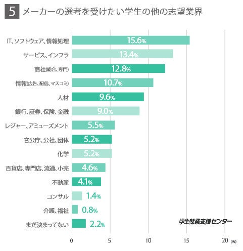 志望業界については「メーカー」をもともと志望している学生が21.8%となったほか、「IT、ソフトウェア、情報処理」12.2%、「サービス、インフラ」10.5%、「商社(総合、専門)」10.0% など、他業界志望の学生もメーカーを視野に入れていることがわかります。