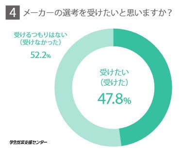 設問4ではメーカーの選考を受けたいかどうか聞いたところ、「受けたい(受けた)」47.8%、「受けるつもりはない(受けなかった)」52.2%とそれぞれ半数でほぼ拮抗しました。