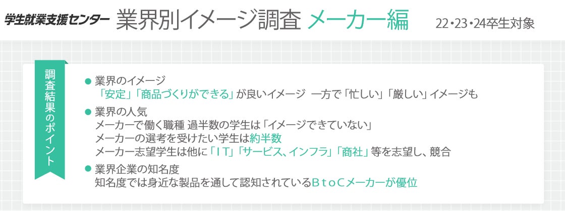 (株)学生就業支援センター(代表:作馬 誠大、本社:東京都港区浜松町2-4-1世界貿易センタービル南館)は、22卒・23卒・24卒学生を対象とした調査『業界別イメージ調査「メーカー編」』の結果を発表しました。