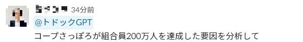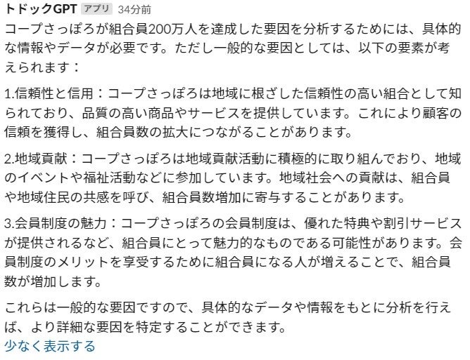 「トドックGPT」とはコープさっぽろ独自の職員向けのChatGPTで、Slack内で文章作成や素案作成、分析、アイデア出しのサポートなどで活用できます。今回の導入により自身で調べて行うより大幅に時間を短縮することや自分の発想の幅を広げることが可能になります。