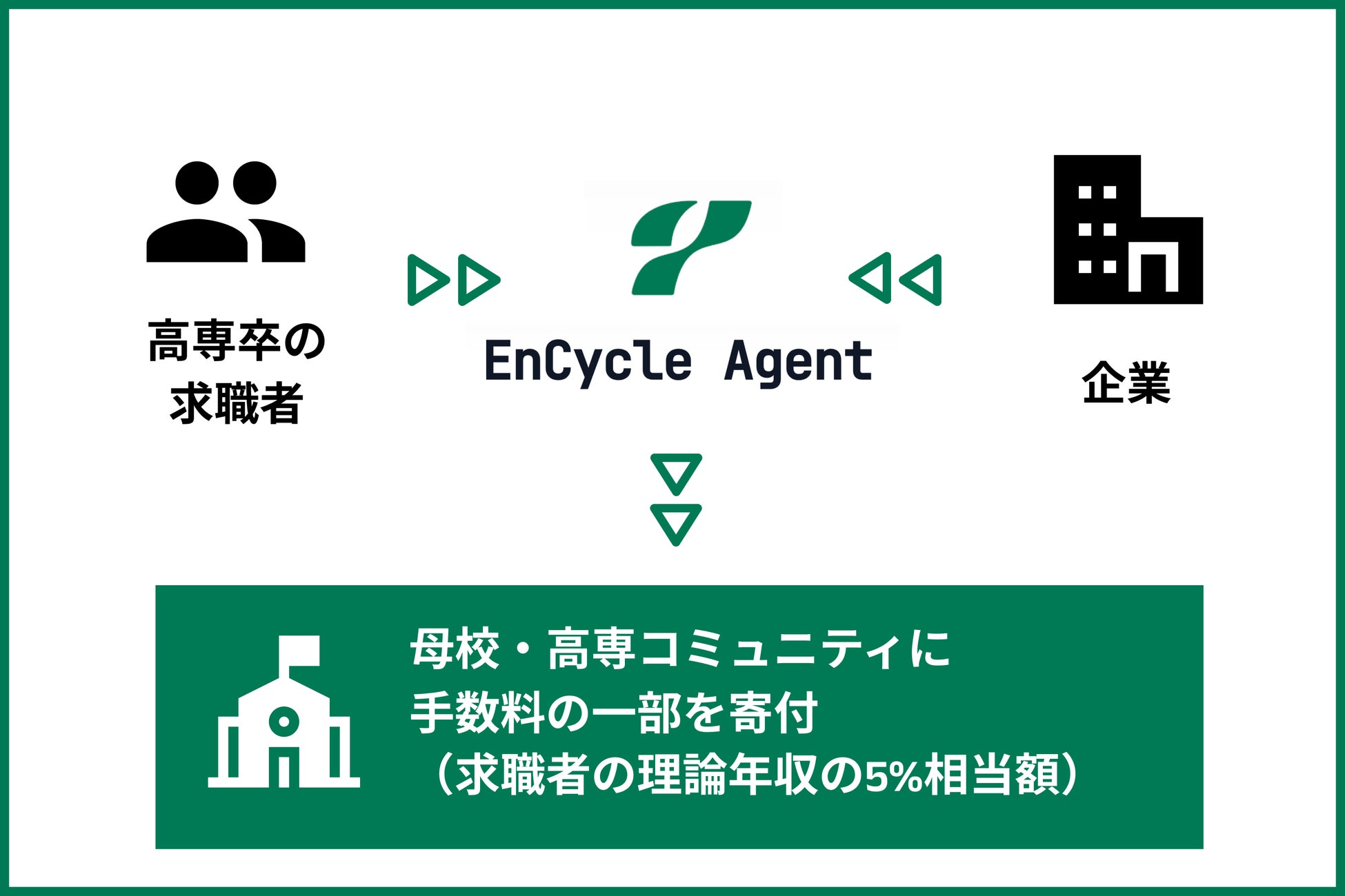 例えば、求職者がEnCycle Agentを通じて希望する企業への入社が決定した場合、その方の理論年収の5%相当額を当社が負担し、出身高専もしくは高専コミュニティへ寄付します。