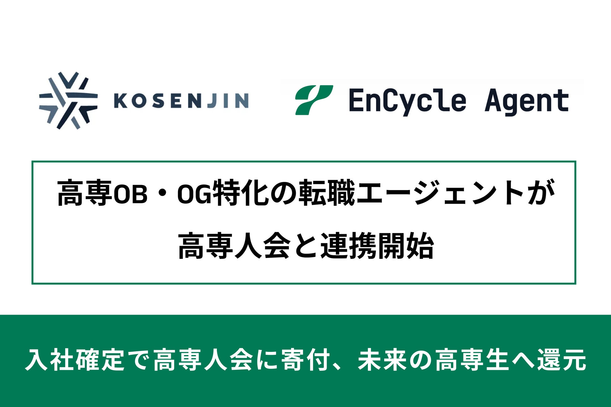 株式会社プロッセル(本社:新潟県新潟市、代表取締役CEO:横山和輝、以下「プロッセル」)が提供する高専卒業生に特化した転職エージェント「EnCycle Agent」は、一般財団法人高専人会(所在地:東京都品川区、代表理事:渋谷修太、以下「高専人会」)と連携したことをお知らせいたします。本連携により、求職者がEnCycle Agentを通じて希望する企業への入社が決定した場合、その方の理論年収の最低1%相当額を当社が負担し、高専人会へ寄付いたします。