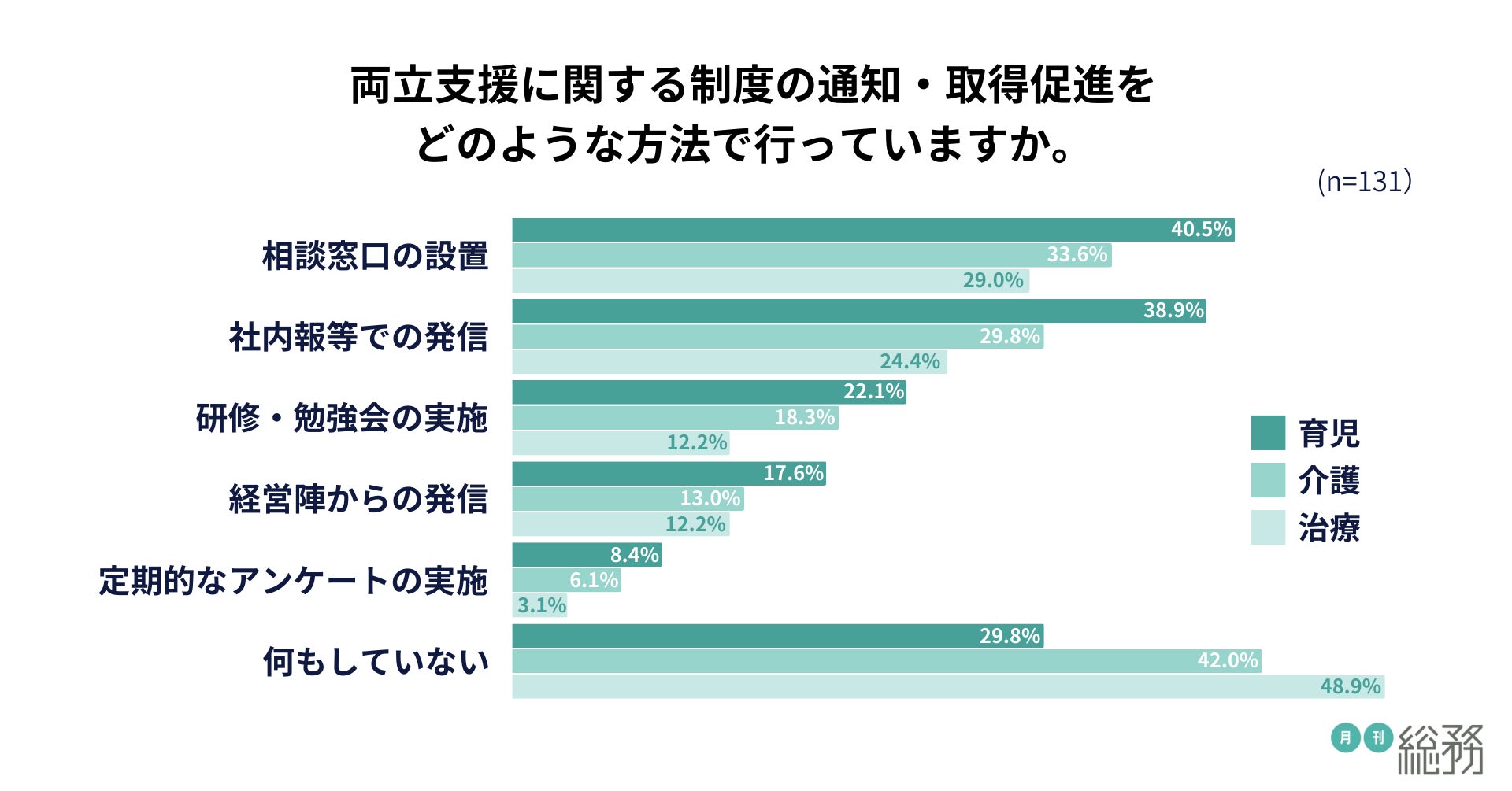 両立支援に関する制度の通知・取得促進をどのような方法で行っているか尋ねたところ、育児は「相談窓口の設置」が40.5%で最多となりました。介護については42.0%、治療については48.9%が「何もしていない」と回答しました(n=131)。