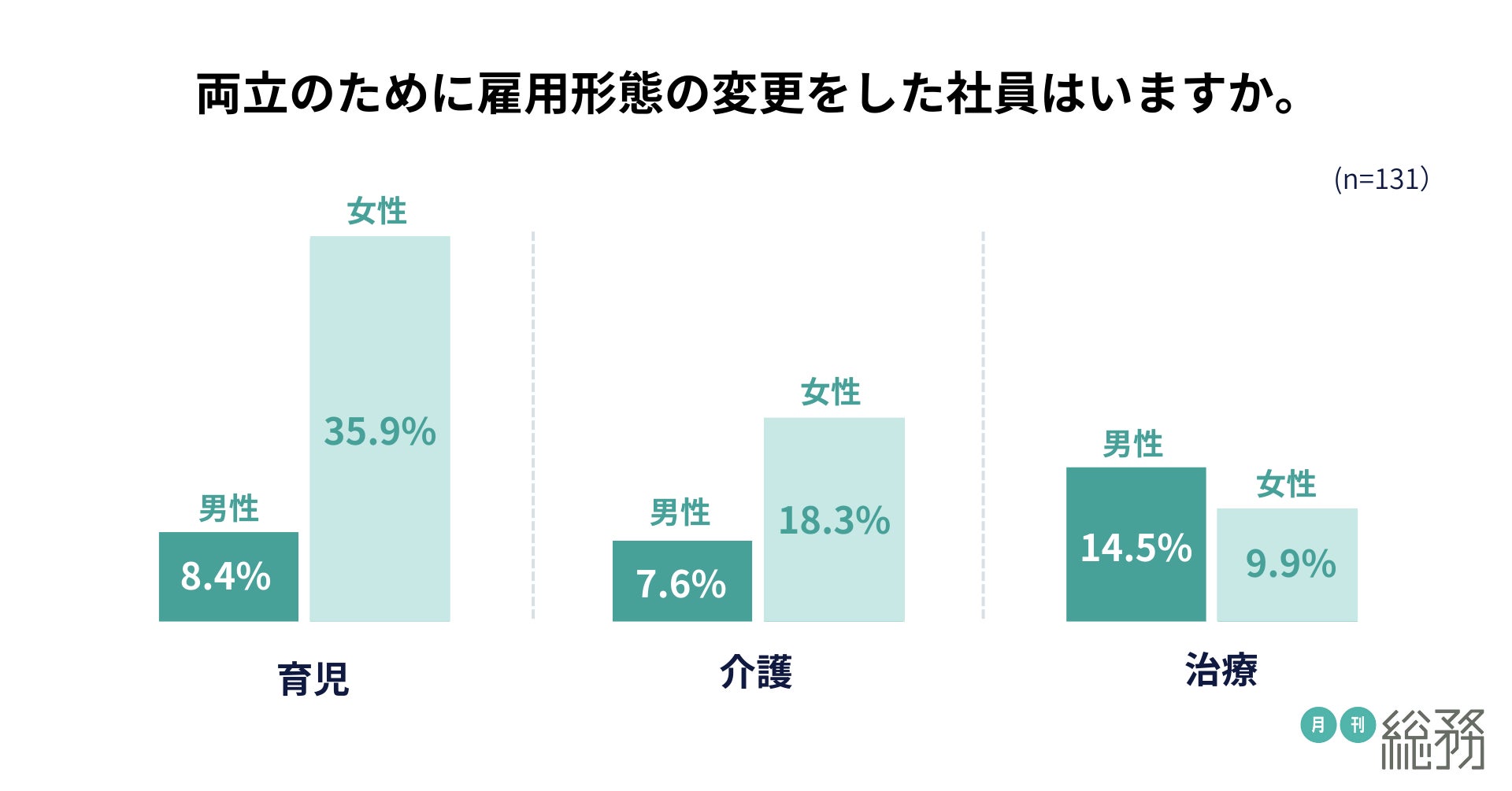 両立のために雇用形態の変更をした社員がいるか尋ねたところ、約4割の企業で育児のために雇用形態を変更した女性社員がいることがわかりました。育児と介護においては女性の方が該当者が多く、男女で負担に偏りがあるとみられます(n=131)。