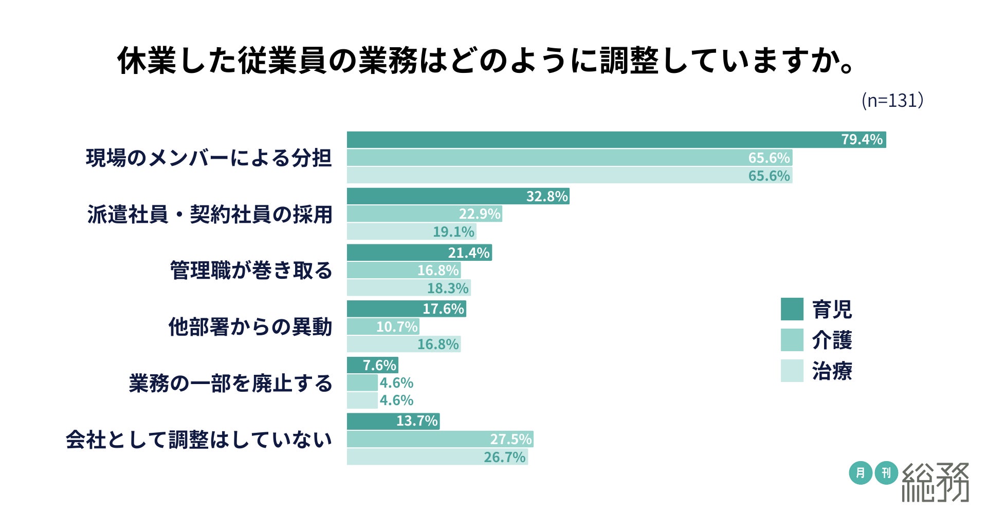 休業した従業員の業務をどのように調整しているか尋ねたところ、育児、介護、治療の3つ共通で、「現場のメンバーによる分担」が最多となりました。また、介護と治療による休業は約3割が「会社として調整はしていない」と回答しました(n=131)。