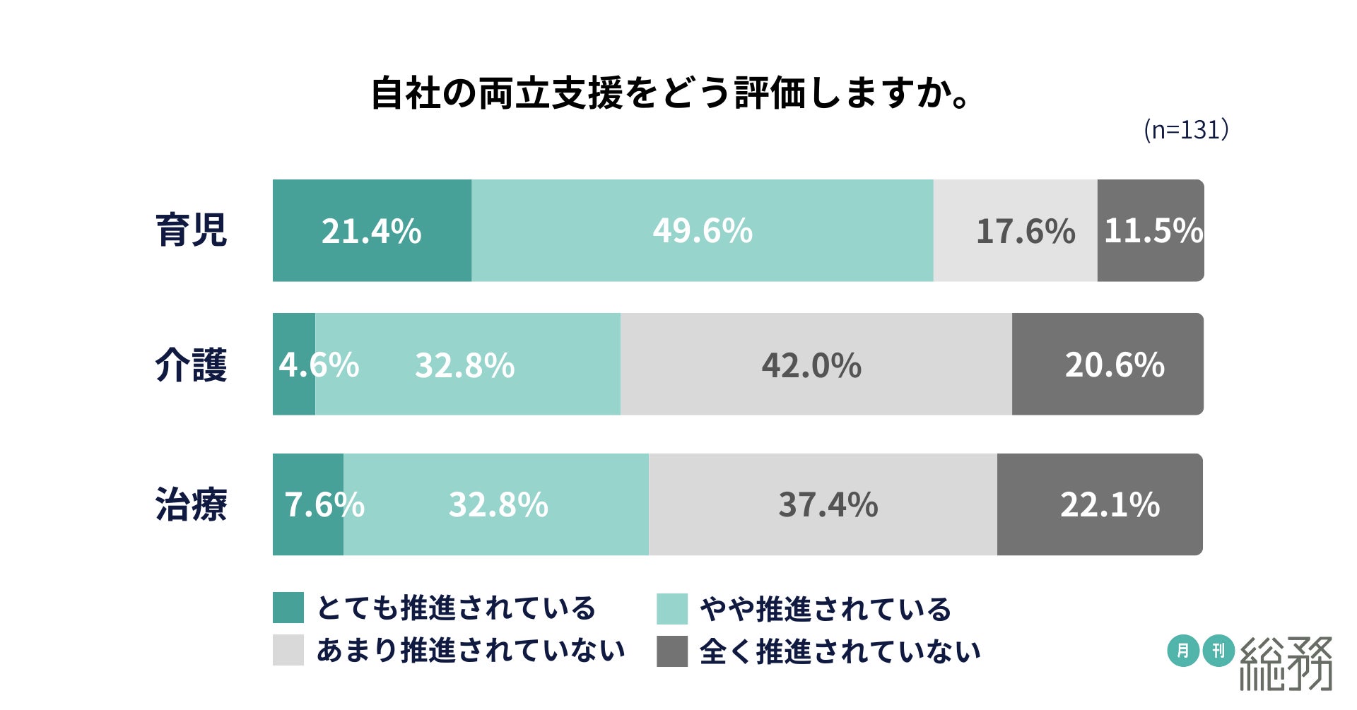 自社の両立支援をどう評価するか尋ねたところ、育児については7割以上が「推進されている」と回答した一方で、介護と治療は約6割が「推進されていない」と回答しました(n=131)。