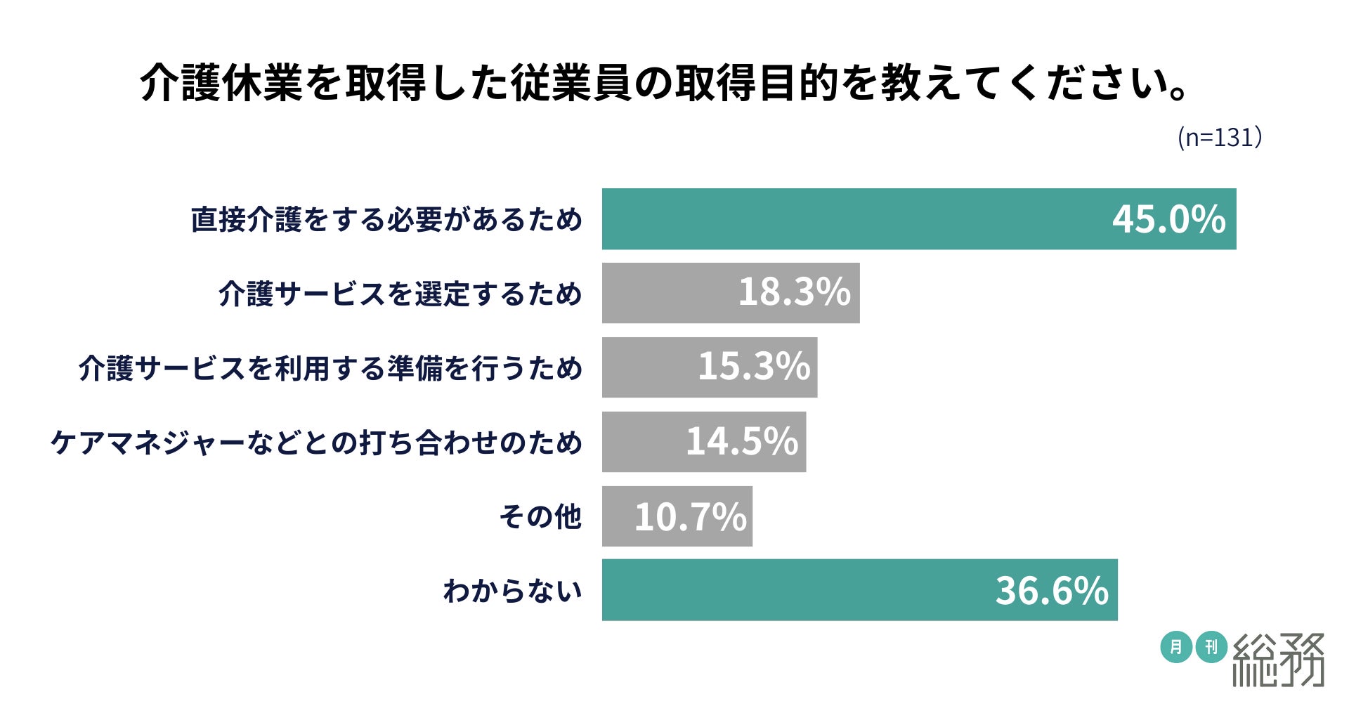 介護休業を取得した従業員の取得目的について尋ねたところ、「直接介護をする必要があるため」が45.0%で最多となりました。また、約4割が介護休業の取得目的を把握していないこともわかりました(n=131)。
