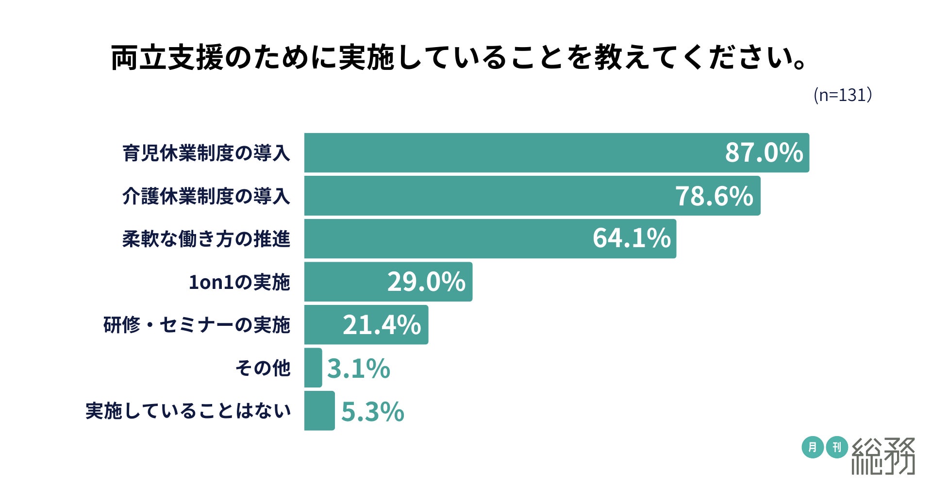 両立支援のために実施していることについて尋ねたところ、「育児休業制度の導入」が87.0%で最も多く、「介護休業制度の導入」が78.6%、「柔軟な働き方の推進」が64.1%と続きました(n=131)。