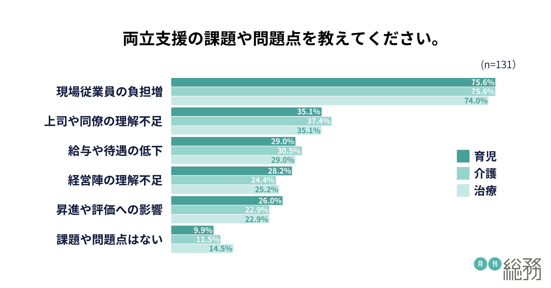 両立支援の課題や問題点について尋ねたところ、育児・介護・治療の全てにおいて、7割以上が「現場従業員の負担増」と回答しました(n=131)。