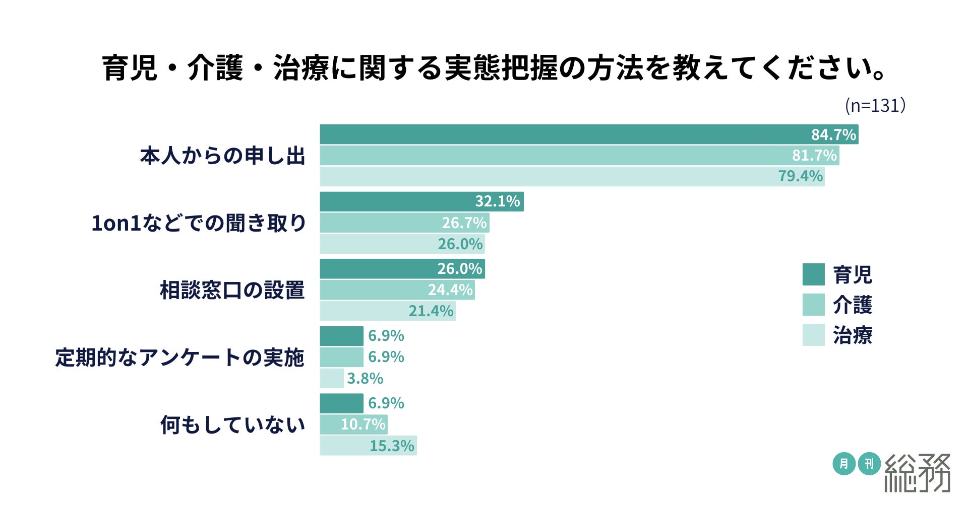 どのような方法で育児・介護・治療に関する実態把握をしているか尋ねたところ、いずれも「本人からの申し出」が最多となりました(n=131)。