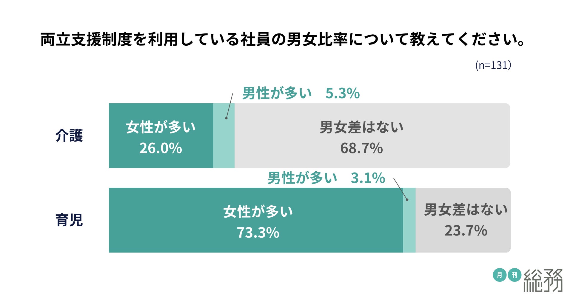 両立支援制度を利用している社員の男女比率について尋ねたところ、介護は約7割が「男女差はない」と回答し、育児は7割以上が「女性が多い」と回答しました(n=131)。