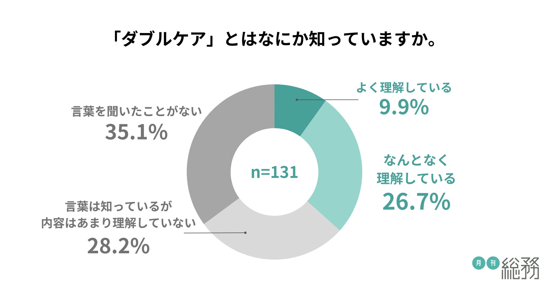 「ダブルケア」とはなにか知っているか尋ねたところ、よく理解しているのは1割未満にとどまり、3割以上が言葉を聞いたことがないと回答しました(n=131)。