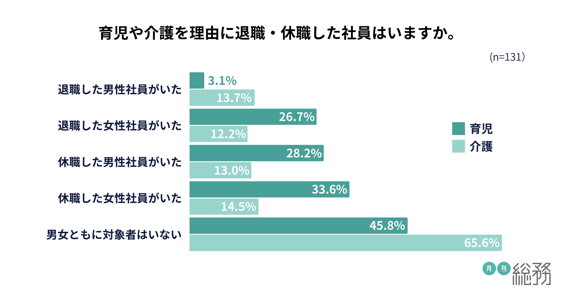 育児や介護を理由に退職・休職した社員がいるか尋ねたところ、育児は退職・休職ともに女性の方が対象者が多いことがわかりました。介護は男女差はあまりありませんが、育児に比べて男性の退職者が多いことがわかりました(n=131)。