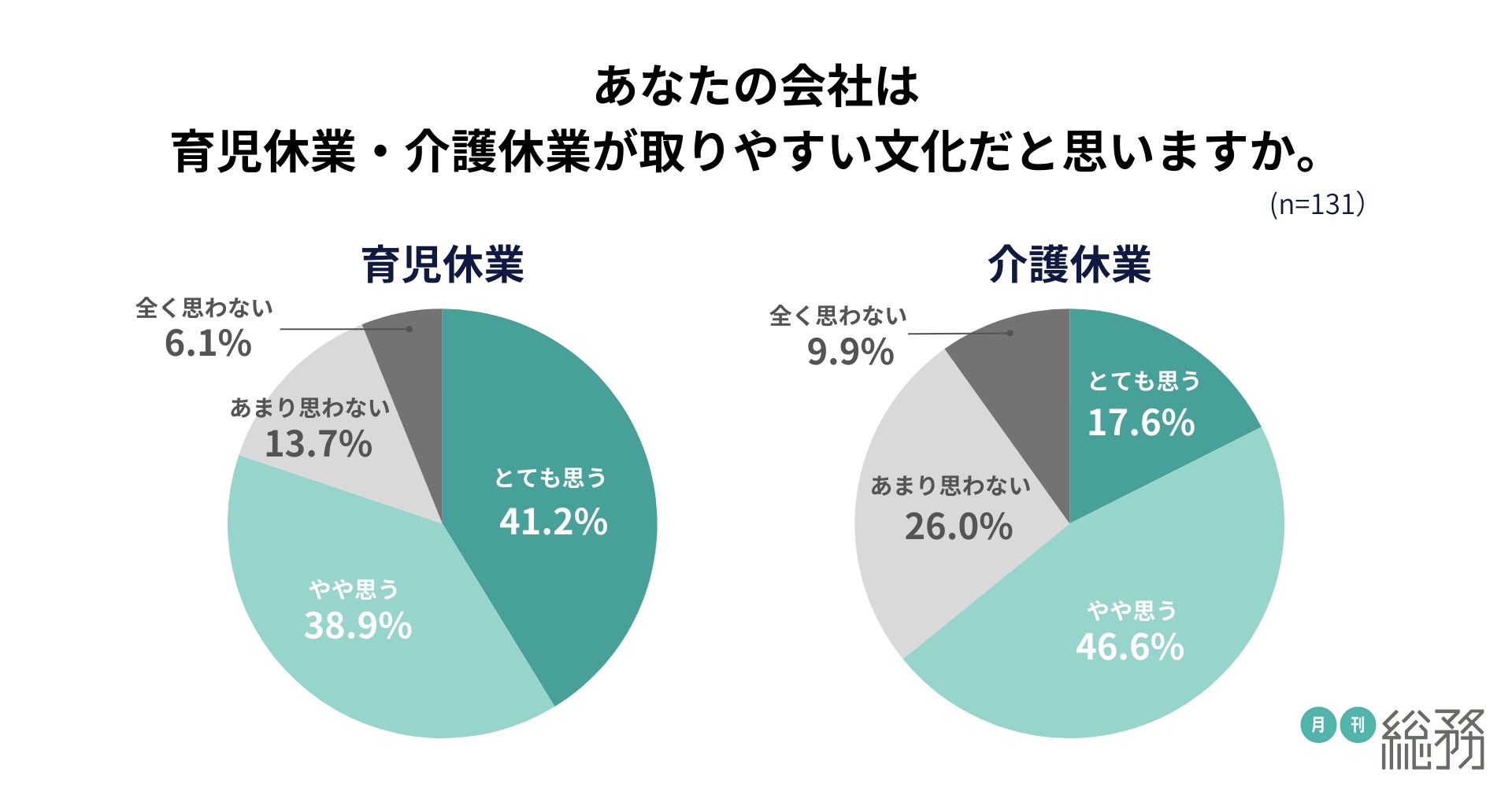 約8割が自身の会社は育児休業が取りやすい文化だと回答。一方、介護休業が取りやすい文化だと思う企業は約6割にとどまる