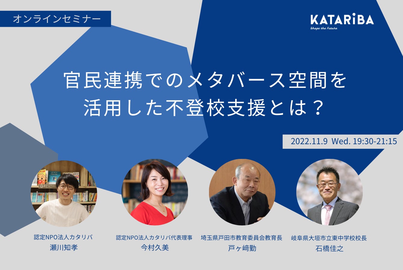 認定特定非営利活動法人カタリバ(本部:東京都杉並区、代表理事:今村久美、以下カタリバ)は、オンライン不登校支援プログラムの取り組みから見えてきたことをもとに、官民連携でのメタバース空間を活用した不登校支援施策の可能性を考えるイベントを 2022 年 11 月 9 日(水)に開催することになりましたのでお知らせします。ゲストには、埼玉県戸田市教育長戸ヶ﨑氏、岐阜県大垣市立東中学校石橋校長を招き、さまざまな立場から不登校の子どもたちの支援にあたっている方々と共に、オンライン支援の在り方について考えます。