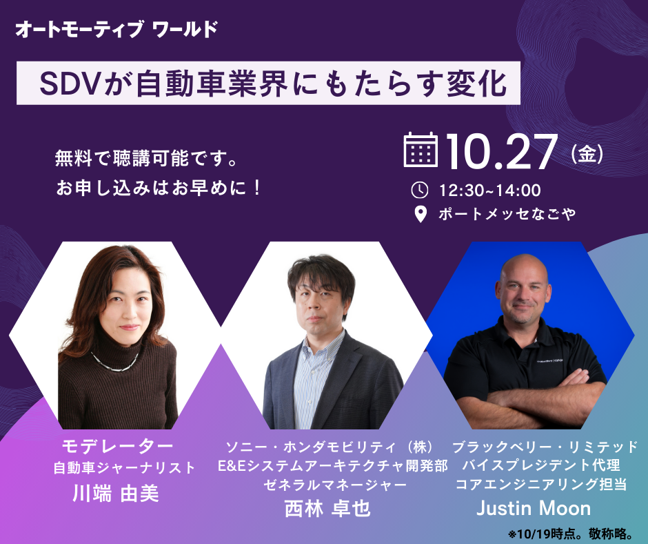 講演開催のお知らせ:BlackBerryが2023年10月27日に第6回[名古屋]オートモーティブ ワールドにて『ソフトウェア定義型自動車(SDV)が自動車業界にもたらす変化』の講演を開催