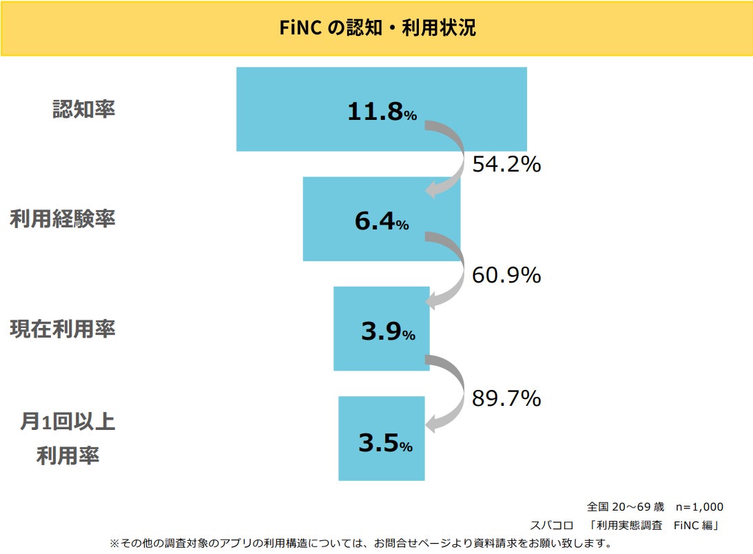 全国の20~69歳の1,000人に聞いたFiNCの浸透状況についてみてみると、認知率11.8%、利用経験率6.4%、現在利用率3.9%、月に1回以上利用率3.5%という結果に。高いダウンロード実績がある一方で約9割の人に認知されていない様子です。