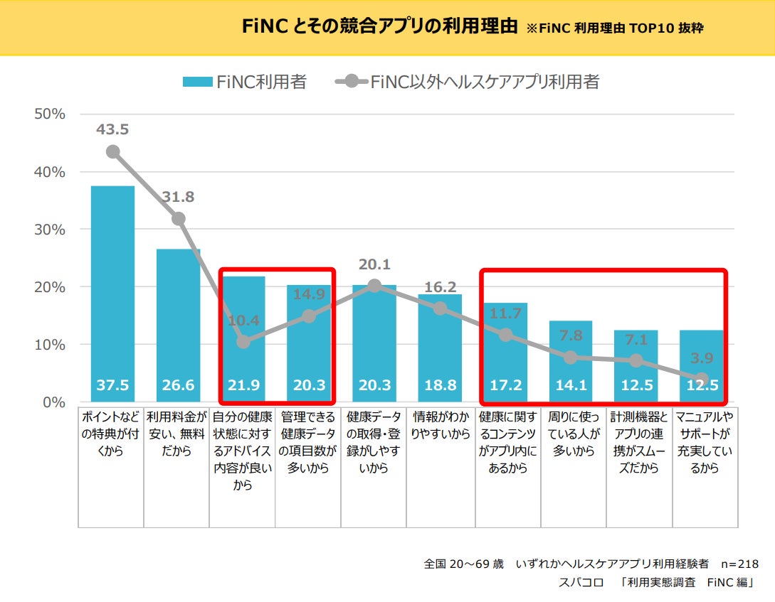 FiNCがその他ヘルスケアアプリと比べて5ポイント以上の高かった項目としては、「自分の健康状態に対するアドバイス内容が良いから」「管理できる健康データ項目数が多いから」「健康に関するコンテンツがアプリ内にあるから」などが挙がる結果となりました。