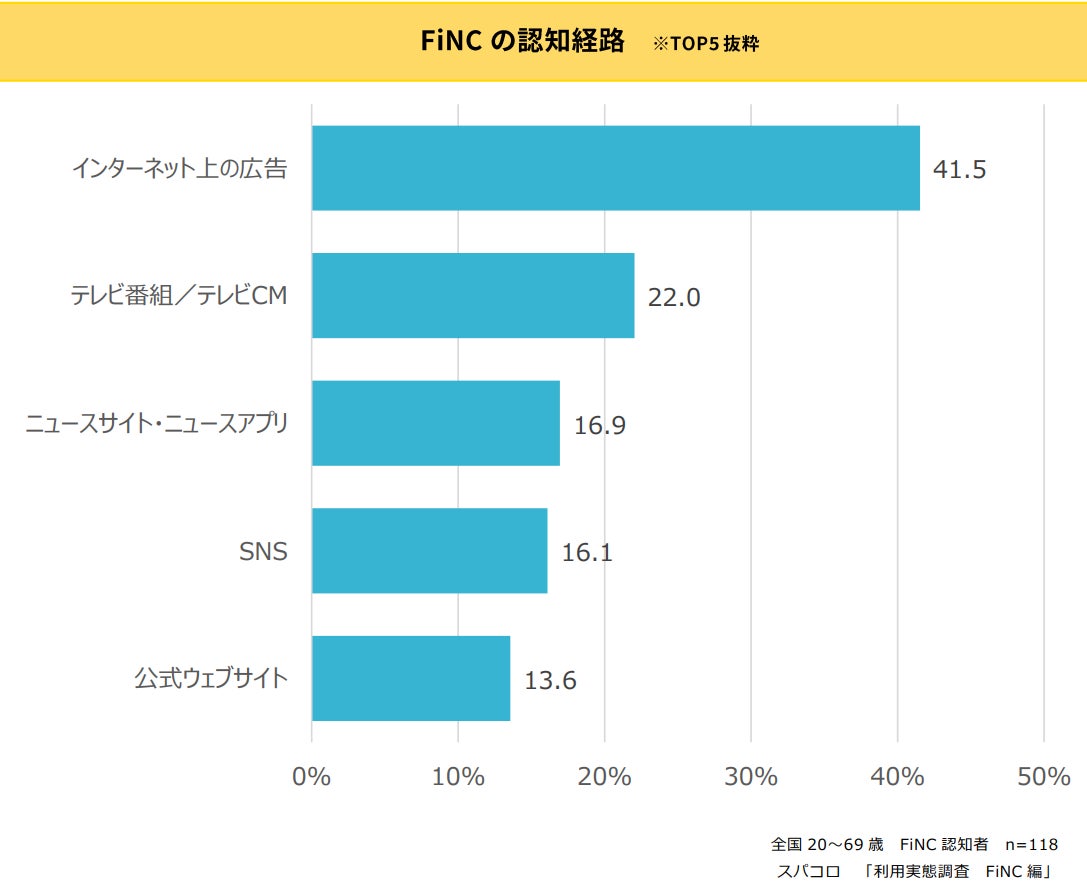 前頁でFiNCの認知率が11.8%とありましたが、実際認知者はどういった経路でFiNCのことを知るのでしょうか。FiNCの認知経路を上位から見ていくと、「インターネットの広告」41.5%、「テレビ番組/テレビCM」22.0%、「ニュースサイト・ニュースアプリ」16.9%が続いています。上位では「テレビ番組/テレビCM」以外がオンラインでの認知経路となっていることがわかります。