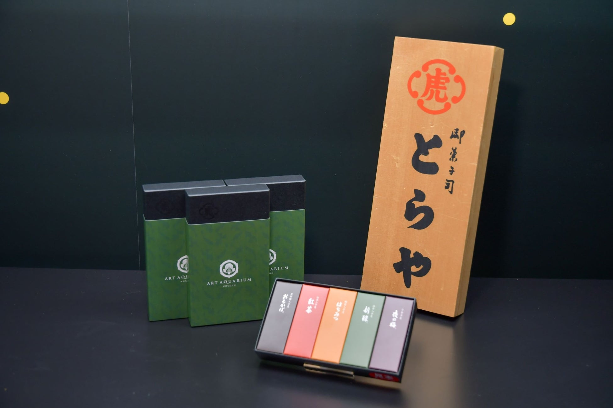とらやは、室町時代後期に京都で創業し、5世紀にわたり和菓子屋を営んでいる。掛け紙は当館オリジナル、中身は食べきりサイズの小形羊羹で、夜の梅(小倉)・おもかげ(黒砂糖入)・新緑(抹茶入)・はちみつ・紅茶の5種セット。